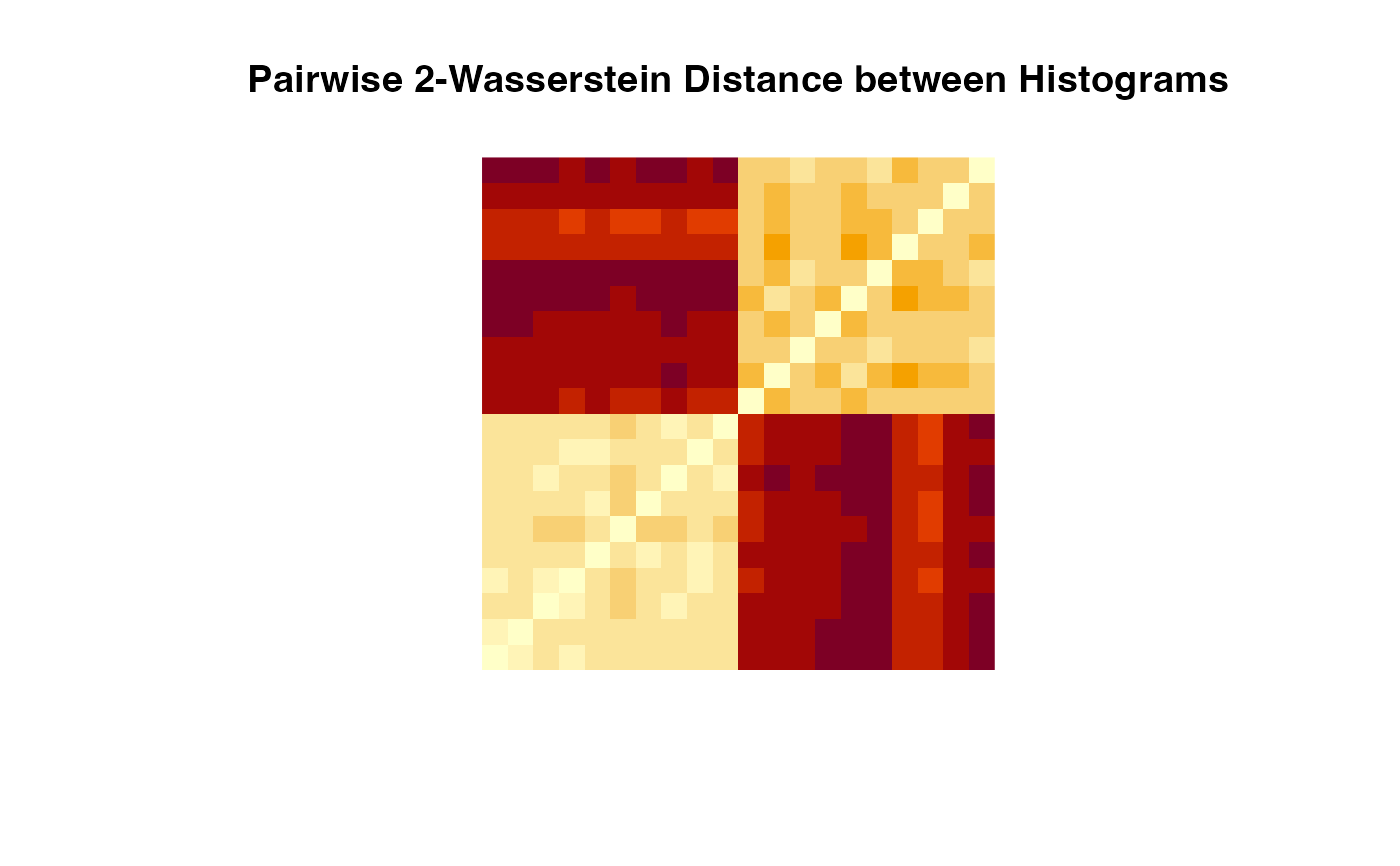 image(pdmat, axes=FALSE, main="Pairwise 2-Wasserstein Distance between Histograms")