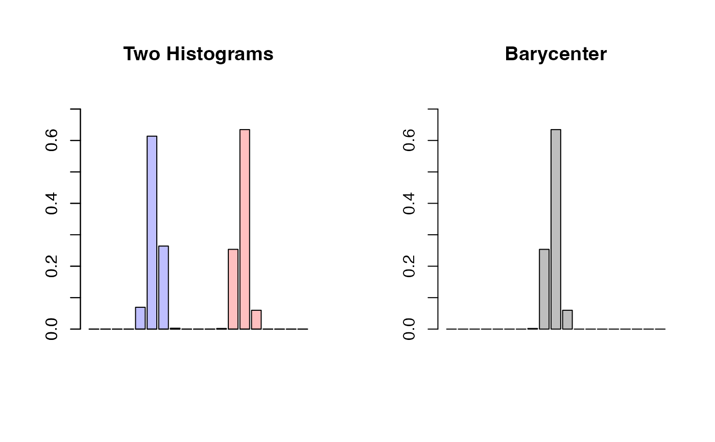 their 2-Wasserstein barycenter using the exact 1D quantile characterization.