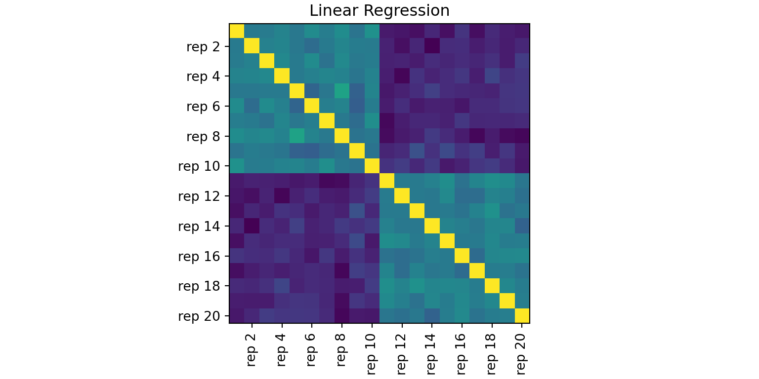 # | cache: true# load necessary packagesimport numpy as npimport pandas as pdimport matplotlib.pyplot as pltfrom sklearn.datasets import load_irisfrom sklearn.preprocessing import StandardScalerimport repsim# set a random seednp.random.seed(1)# prepare the prototypeiris = load_iris(as_frame=True).frame.iloc[:, :4]url ="https://vincentarelbundock.github.io/Rdatasets/csv/datasets/USArrests.csv"usarrests = pd.read_csv(url, index_col=0)X = StandardScaler().fit_transform(iris.sample(50, random_state=1))Y = StandardScaler().fit_transform(usarrests)n, p_X, p_Y = X.shape[0], X.shape[1], Y.shape[1]# generate 10 of each by perturbationmats = []for _ inrange(10): mats.append(X + np.random.normal(scale=1.0, size=(n, p_X)))for _ inrange(10): mats.append(Y + np.random.normal(scale=1.0, size=(n, p_Y)))# compute similaritiesout_R2 = repsim.pwcca(mats)# visualizefig, ax = plt.subplots(figsize=(8, 4), constrained_layout=True)labs = [f"rep {i}"for i inrange(1, 21)]even_idx =list(range(1, 20, 2))im = ax.imshow(out_R2, origin="upper")ax.set_title("Linear Regression")