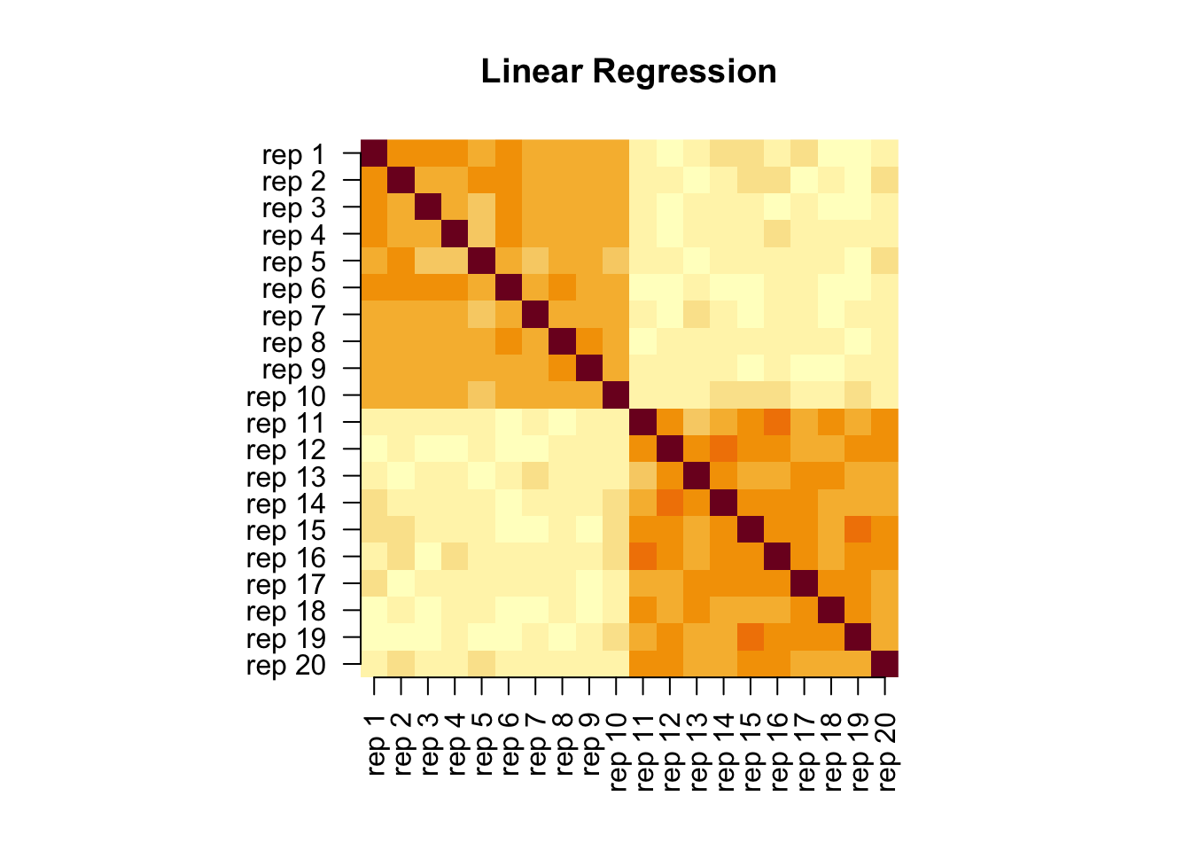 # load necessary packageslibrary(repsim)# set a random seedset.seed(1)# prepare the prototypeX <-as.matrix(scale(as.matrix(iris[sample(1:150, 50, replace =FALSE), 1:4])))Y <-as.matrix(scale(as.matrix(USArrests)))n <-nrow(X)p_X <-ncol(X)p_Y <-ncol(Y)# generate 10 of each by perturbationmats <-vector("list", length =20L)for (i in1:10){ mats[[i]] <- X +matrix(rnorm(n * p_X, sd =1), nrow = n)}for (j in11:20){ mats[[j]] <- Y +matrix(rnorm(n * p_Y, sd =1), nrow = n)}# compute similaritiesout_R2 <-pwcca(mats)# visualize: two heatmaps side by sidelabs <-paste0("rep ", 1:20)par(pty ="s")image(out_R2[, 20:1], axes =FALSE, main ="Linear Regression")axis(1, seq(0, 1, length.out =20), labels = labs, las =2)axis(2, at =seq(0, 1, length.out =20), labels =rev(labs), las =2)